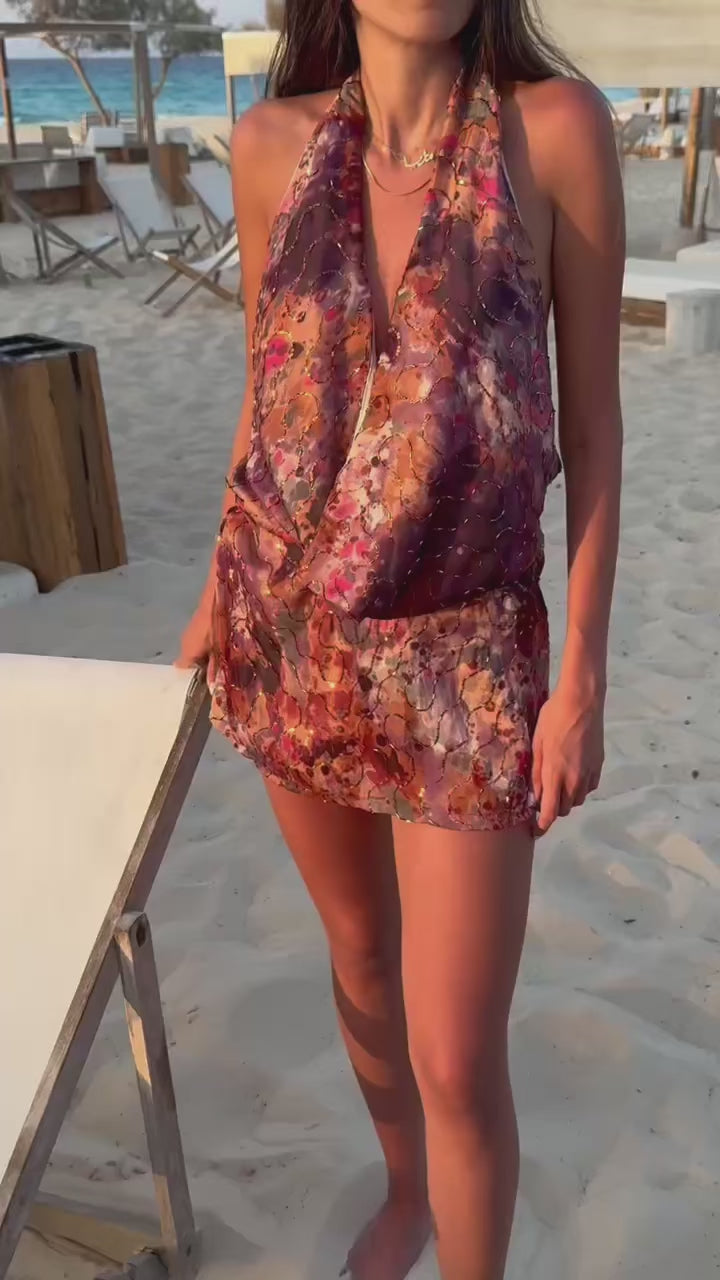 Made from hand-beaded fabric that glistens with every move, The Flirtini is your go-to for golden hour. It features a halter neckline, open back with a tie-up string, and an elastic waist, this dress brings just the right amount of flirt.