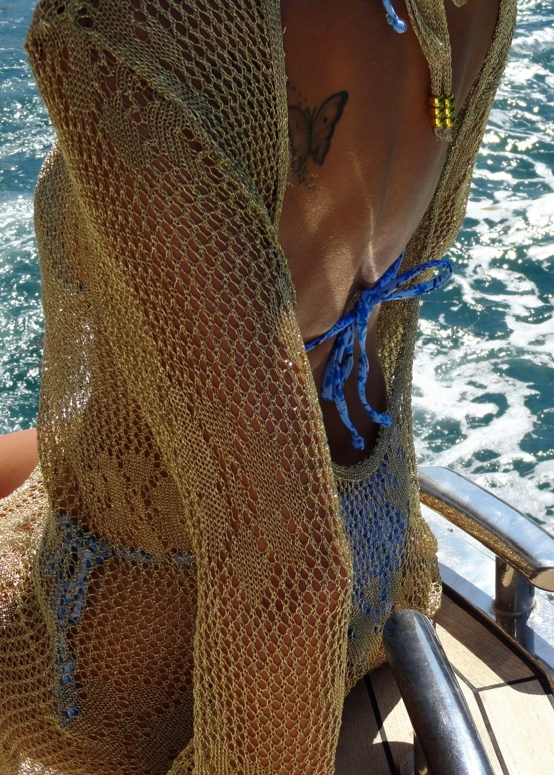 Made with soft, gold-thread mesh that catches the light with every move. It’s open-backed, flowy, and detailed with gold touches.