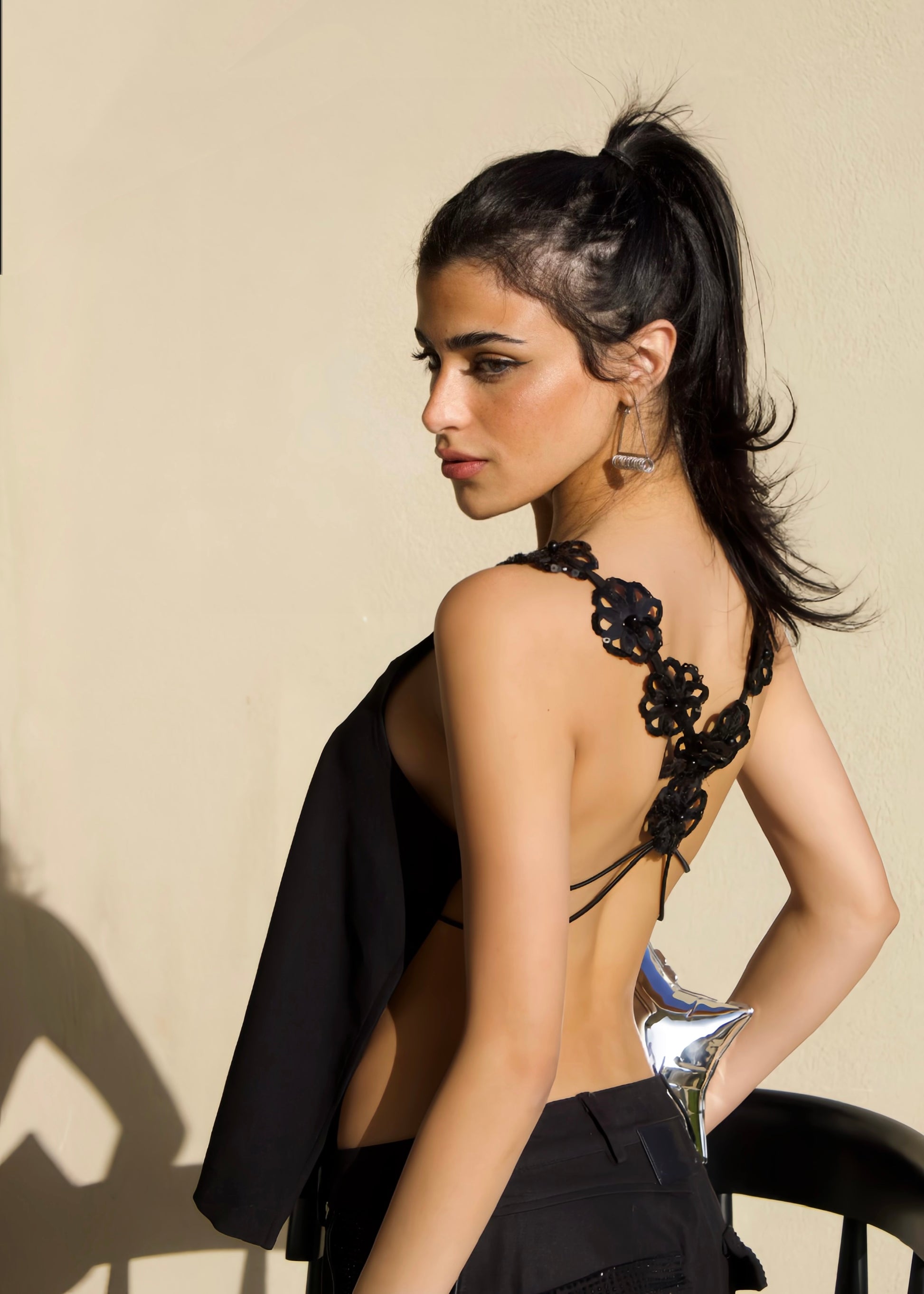 This open-back black top features handmade floral lace straps that bloom across the shoulders.