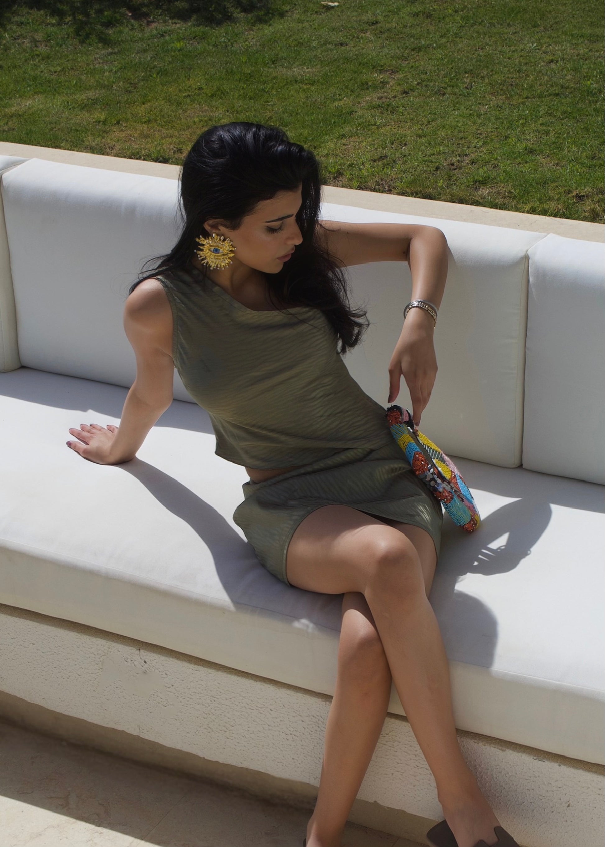 This handmade two-piece set features a one-shoulder asymmetrical top and a matching mini skirt in a muted olive hue with a subtle texture that catches the light.